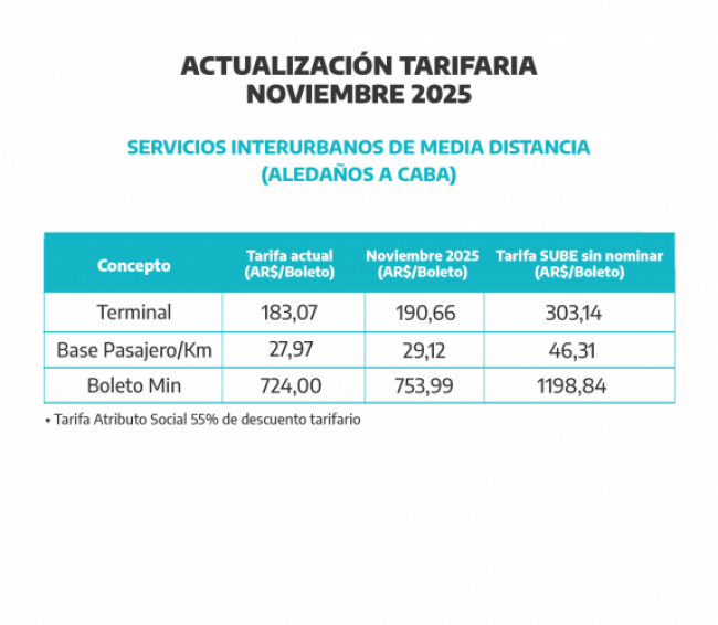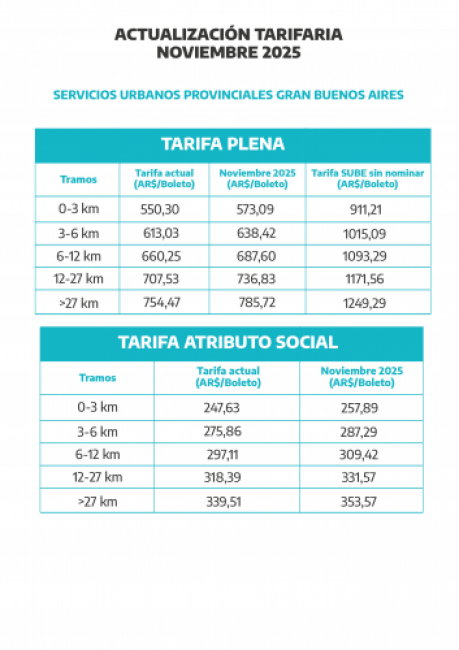 En este sentido, esta Cartera Provincial pone en conocimiento público de todas las personas usuarias los cuadros tarifarios actualizados de acuerdo al Índice de Precios al Consumidor (IPC) Nivel General de la Región Gran Buenos Aires, relevado por el INSTITUTO NACIONAL DE ESTADÍSTICAS Y CENSO (INDEC), correspondiente al periodo mensual de septiembre del 2025, de conformidad con el mecanismo previsto en los artículos 4° y 5° de la Resolución N° 81/25, y que entrarán en vigencia a partir de las 00 hs. del día 1 de noviembre del corriente año.