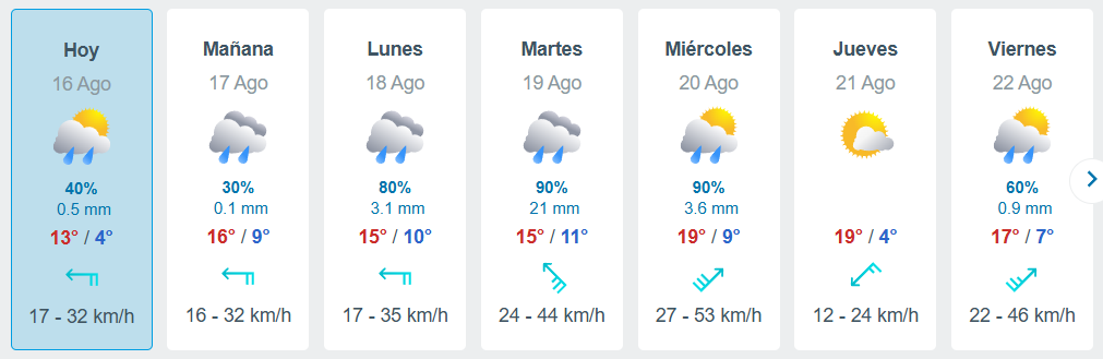 Para el miércoles 20 de agosto, se espera una última tanda residual de lluvias aisladas durante las primeras horas del día, asociada a la parte trasera del sistema de baja presión. Posteriormente, el tiempo mejorará repentinamente con un brusco descenso de la nubosidad y condiciones ventosas del sector oeste, lo que permitirá el ingreso de aire muy seco y estable en la región.