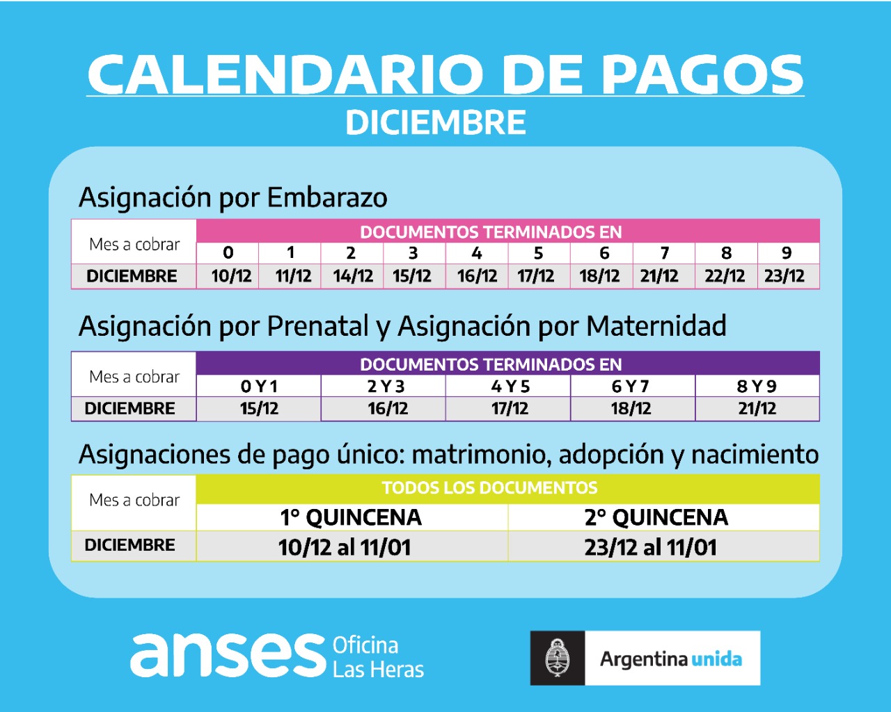 Además, a partir del 10 de diciembre se reiniciarán los pagos de las Asignaciones de Pago Único y Asignaciones Familiares de Pensiones No Contributivas, que actualmente transitan sus cobros hasta el 9 de diciembre, vigentes para todas las terminaciones de documento.