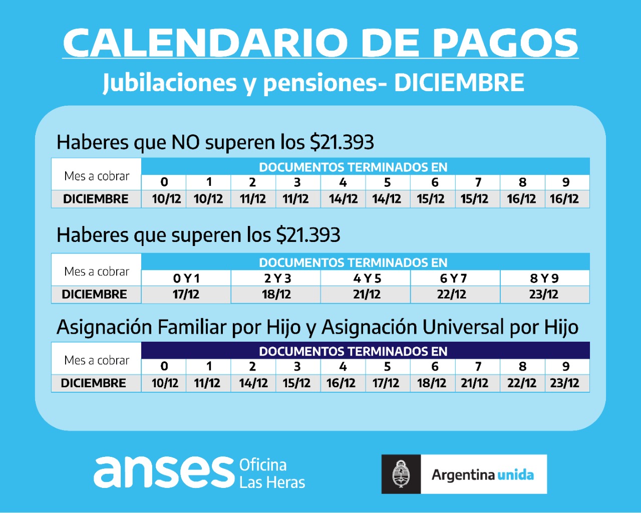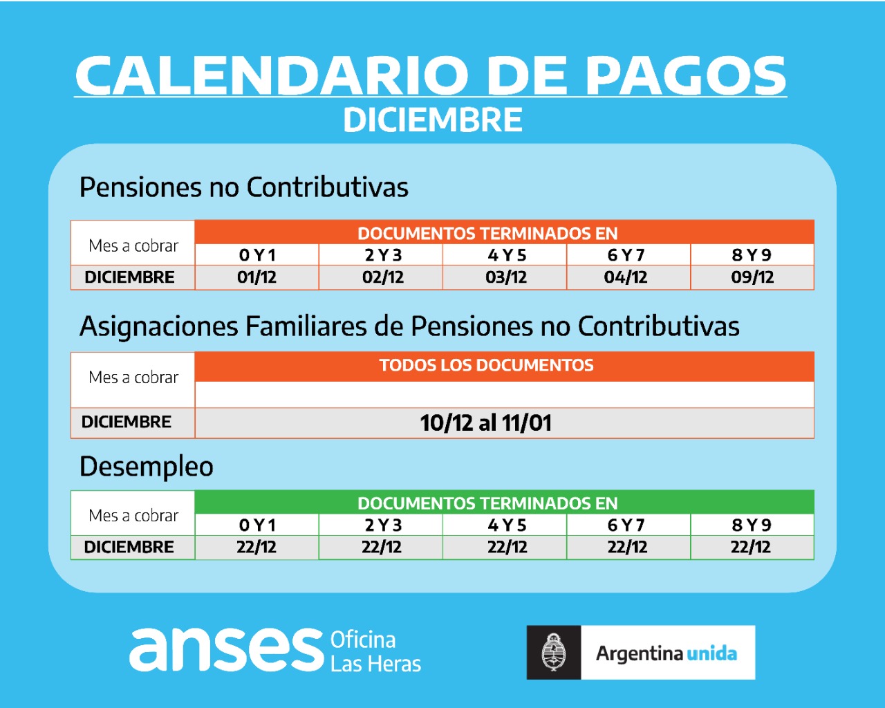 Además, a partir del 10 de diciembre se reiniciarán los pagos de las Asignaciones de Pago Único y Asignaciones Familiares de Pensiones No Contributivas, que actualmente transitan sus cobros hasta el 9 de diciembre, vigentes para todas las terminaciones de documento.