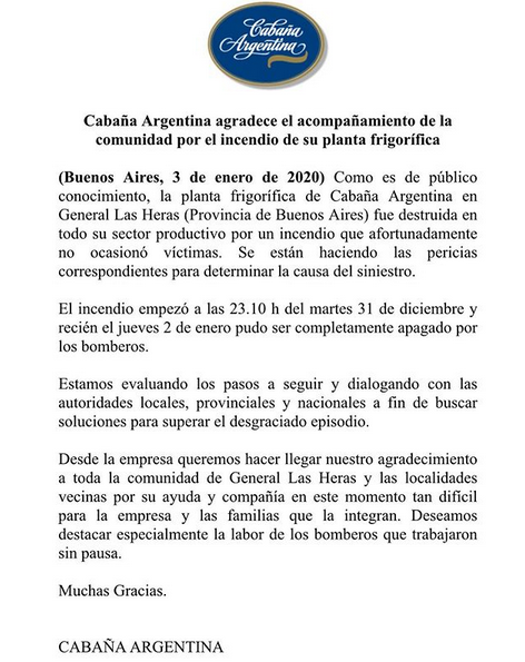 La empresa Cabaña Argentina agradeció mediante un comunicado, a la comunidad de General las Heras y localidades vecinas por la ayuda brindada.