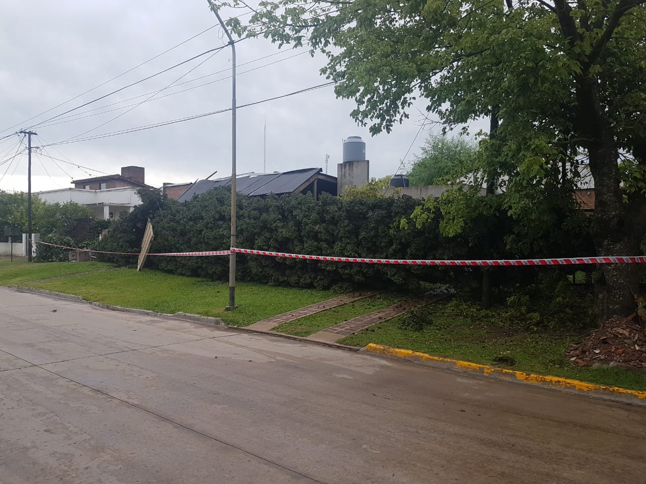 Muy fuerte fue el viento que sopló en la madrugada de hoy en nuestra ciudad y muchos fueron los servicios que debieron atender los Bomberos Voluntarios de General Las Heras, uno de ellos fue en la calle Santiago villamayor y San Lorenzo, donde de milagro un pino de unos 30 mtr de altura no cayo de lleno sobre la casa rompiendo la galería y tirando el pilar de luz.