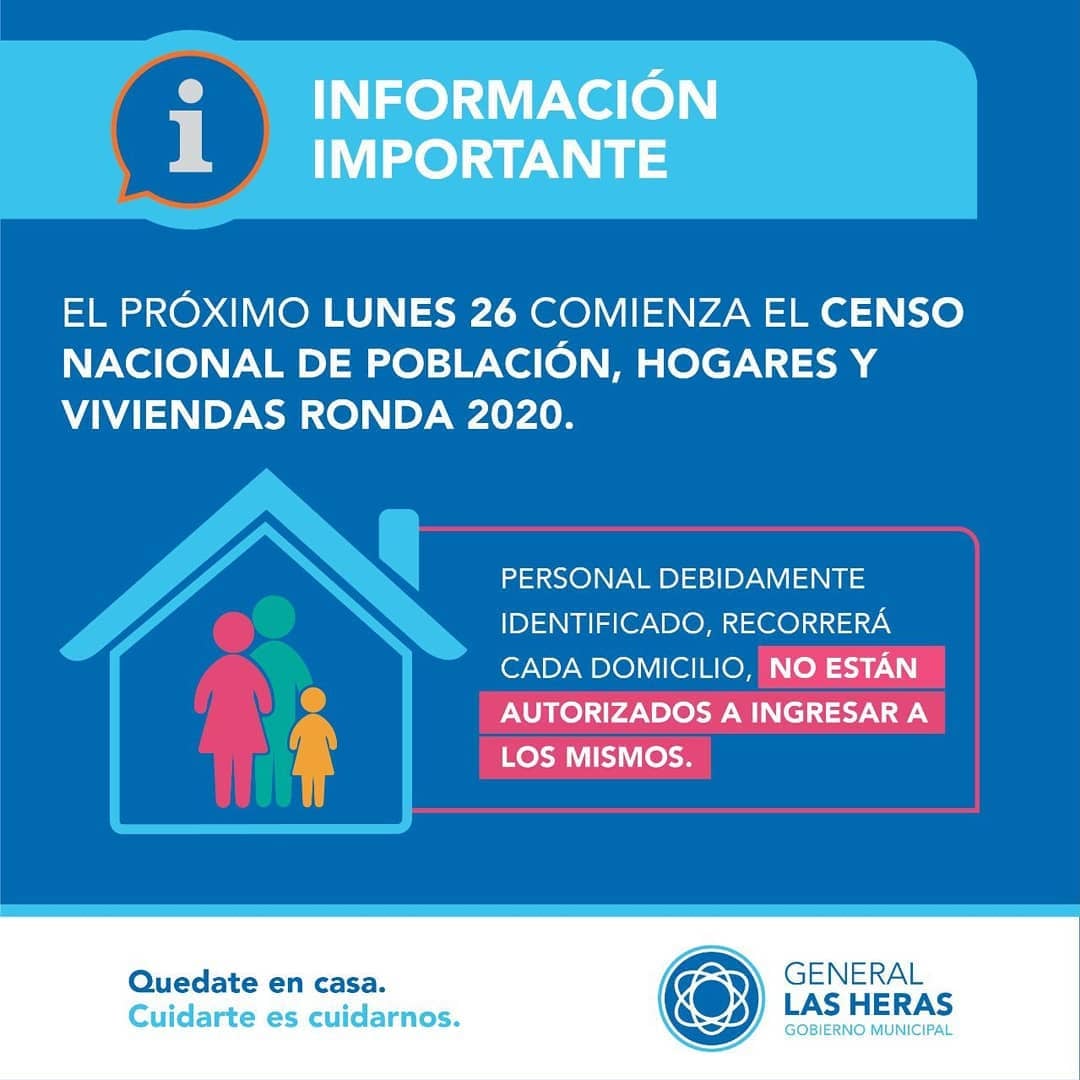Desde el día de hoy 26 de octubre, se estarán realizando tareas pre-censales, correspondientes al Censo Nacional de Población, Hogares y Viviendas 2020 en General Las Heras. Estas tareas de relevamiento, es conocida como Censo Ronda.