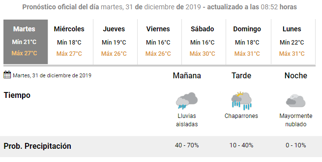 Una jornada con tormentas y lluvias aisladas se prevé para el último día de 2019 en nuestra ciudad y alrededores, aunque por la noche, cuando se celebre la pronta llegada del Año Nuevo, habría mejoras climáticas con cielo mayormente nublado, informó el Servicio Meteorológico Nacional (SMN).