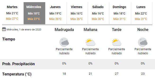 Para el miércoles 1 de enero se prevé una mejoría notoria, con cielo mayor a parcialmente nublado, vientos provenientes del sudeste rotando al este y marcas térmicas que oscilarán entre los 18 y los 27 grados.