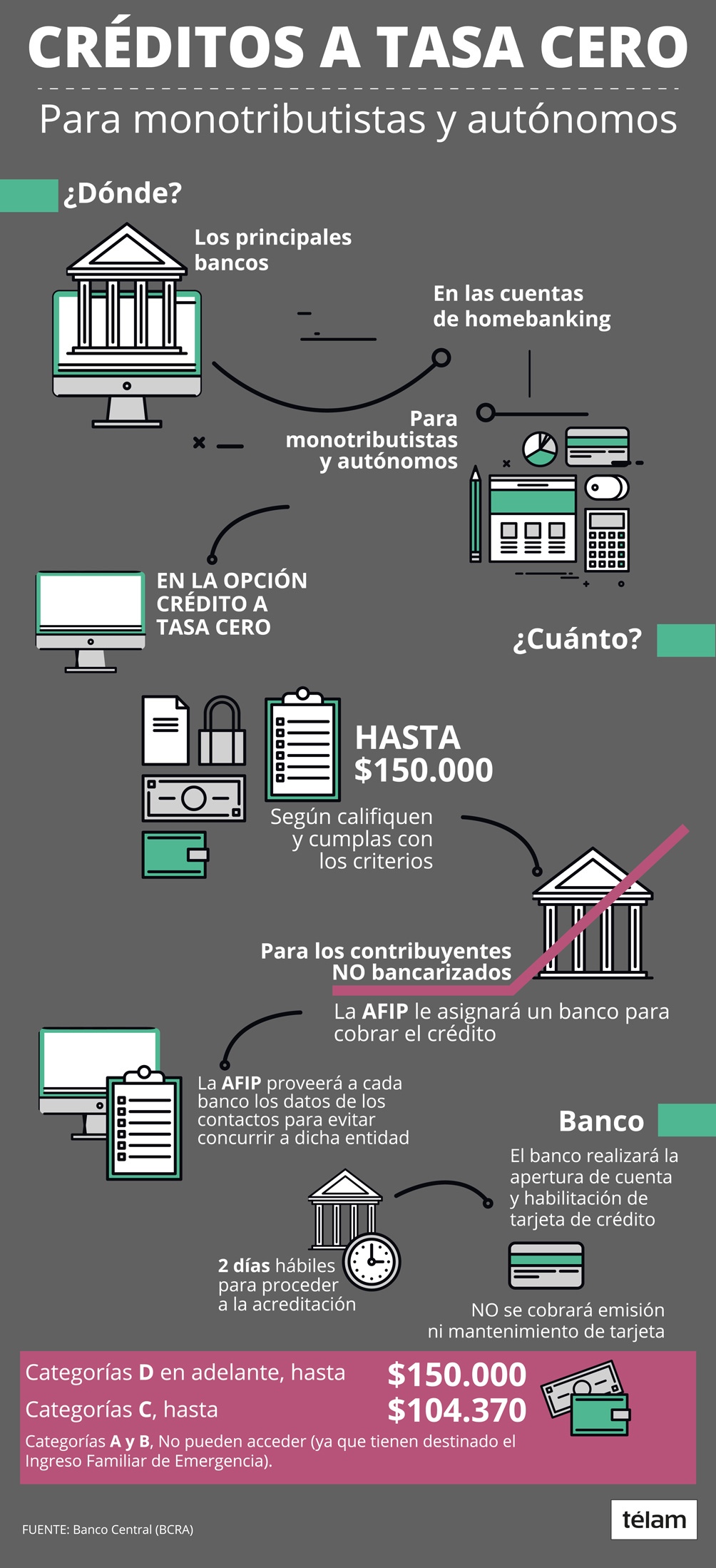 El crédito deberá ser otorgado en tres cuotas iguales, mensuales y consecutivas con un máximo de $150.000 para las categorías D en adelante, de hasta $104.370 para la categoría C, de hasta $78.277 para la categoría B y de hasta $52.184 para la categoría A de monotributo.