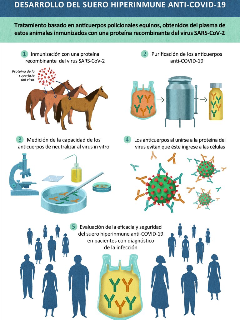 Este suero terapéutico es una inmunoterapia basada en anticuerpos policlonales equinos, obtenidos mediante la inyección de una proteína recombinante del SARS-CoV-2 en estos animales, inocua para ellos, que hace que generen gran cantidad de anticuerpos neutralizantes. Luego de la extracción del plasma –un proceso similar al que se utiliza cuando se extrae plasma de personas (plasmaféresis)– estos anticuerpos se purifican y procesan, a través de un proceso biotecnológico, para obtener fragmentos de los anticuerpos con alta pureza y buen perfil de seguridad.