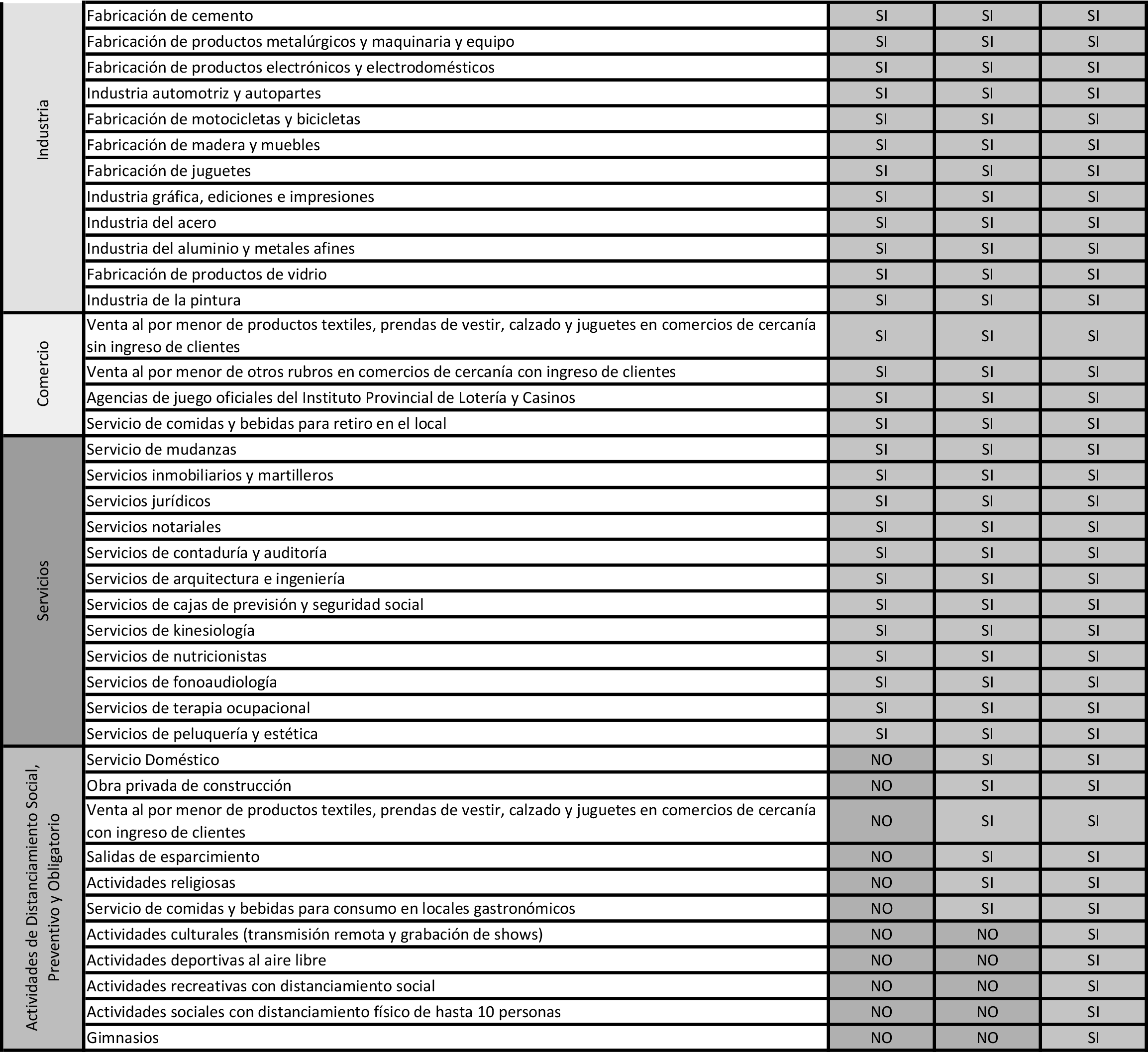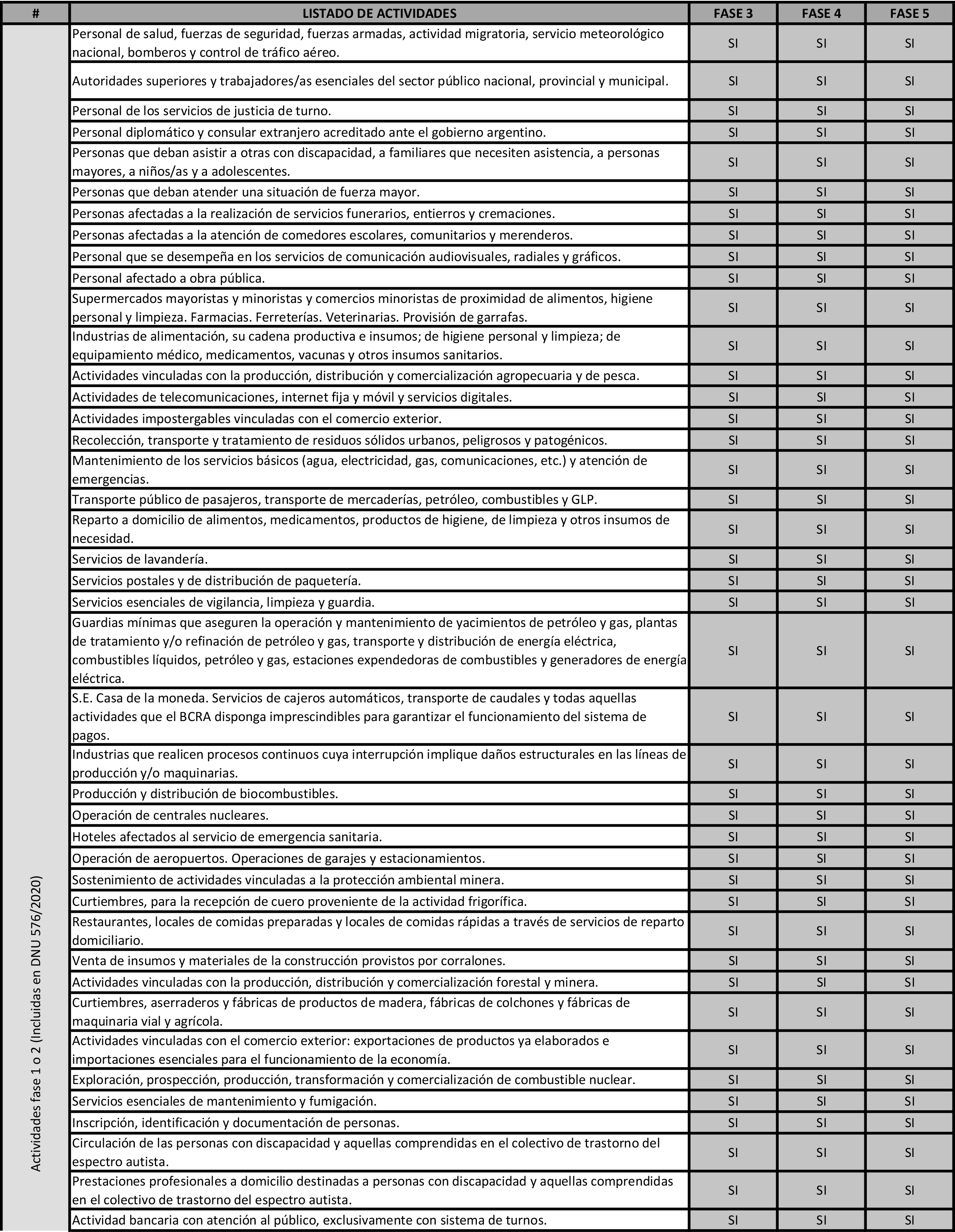 -Fase 4 (nuevo criterio): Se ubicarán aquellos municipios que en alguna de las últimas dos semanas hubiesen tenido más de 10 nuevos casos COVID cada 100.000 habitantes por semana. En dichos municipios estarán permitidas, además del resto de las actividades habilitadas hasta la Fase 3, las obras privadas de construcción; el consumo en locales gastronómicos; las salidas de esparcimiento; los comercios de cercanía incluyendo textil y jugueterías con ingreso de clientes y el servicio doméstico.