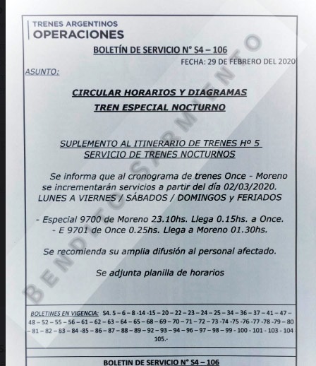La decisión anunciada por el boletín de servicio N° S4-106 amplía el horario entre Once- Moreno y Moreno -Once con dos servicios nuevos, el 9700 y el 9701.