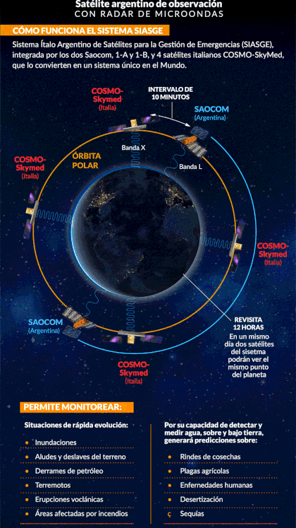 Los satélites SAOCOM fueron especialmente diseñados para detectar la humedad del suelo y obtener información de la superficie terrestre en cualquier condición meteorológica u hora del día.