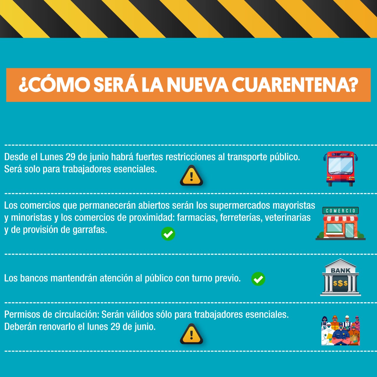 - Transporte público. A partir de ayer, 29 de junio, el transporte público solo puede ser utilizado por los trabajadores de las actividades esenciales, que se reducen a 24 áreas. El Gobierno está instrumentando un sistema de control a través de la tarjeta SUBE para garantizar el cumplimiento.