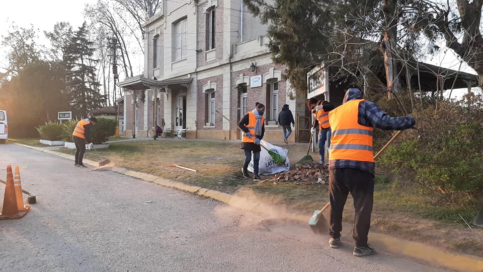 Integrantes del Programa Nacional de Inclusión Socioproductiva y Desarrollo Local “Potenciar Trabajo”, colaboran con el personal de servicios públicos de Villars, en tareas de limpieza en diferentes sectores de la localidad.