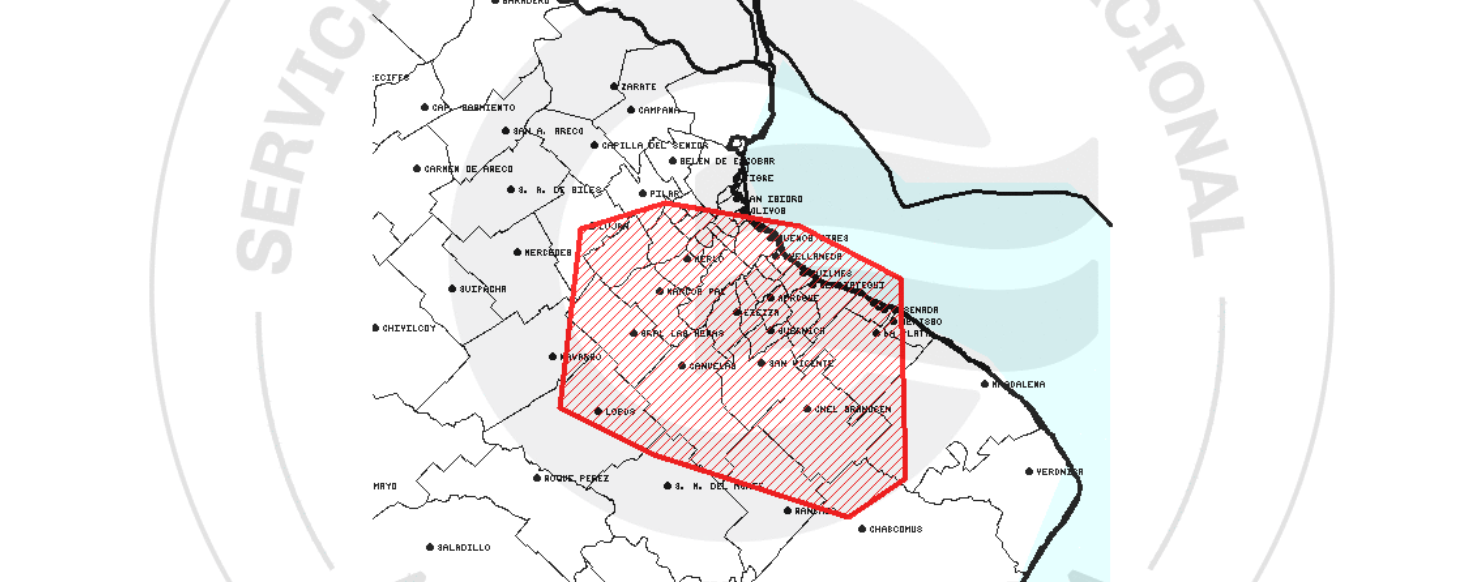 Los distritos comprendidos dentro de la presente alerta son los siguientes: Zonas: BUENOS AIRES: Almirante Brown – Avellaneda – Berazategui – Berisso – Brandsen – Cañuelas – Chascomus – Ensenada – Esteban Echeverria – Ezeiza – Florencio Varela – Gral Belgrano – Gral Las Heras – Gral Paz – Gral Rodriguez – Gral San Martin – Hurlingham – Ituzaingo – Jose C. Paz – La Matanza – La Plata – Lanus – Lobos – Lomas de Zamora – Lujan – Magdalena – Malvinas Argentina – Marcos Paz – Merlo – Moreno – Moron – Navarro – Pilar – Pte Peron – Quilmes – S. M. del Monte – San Miguel – San Vicente – Tres de Febrero – Vicente Lopez.