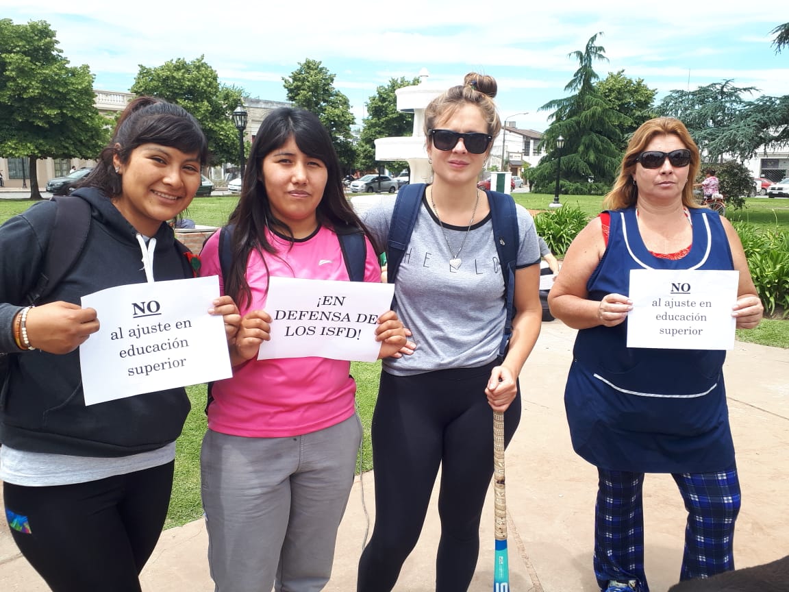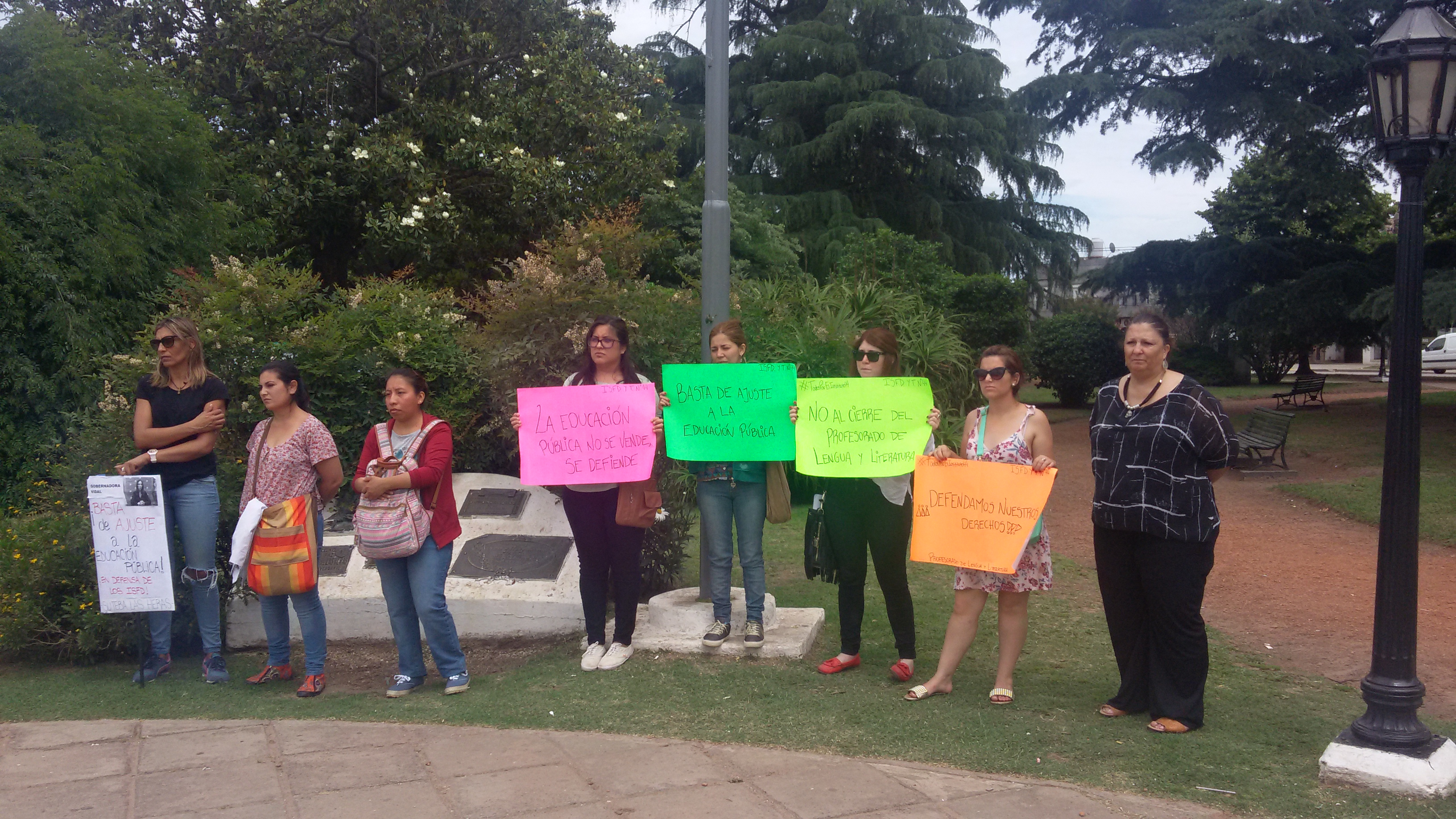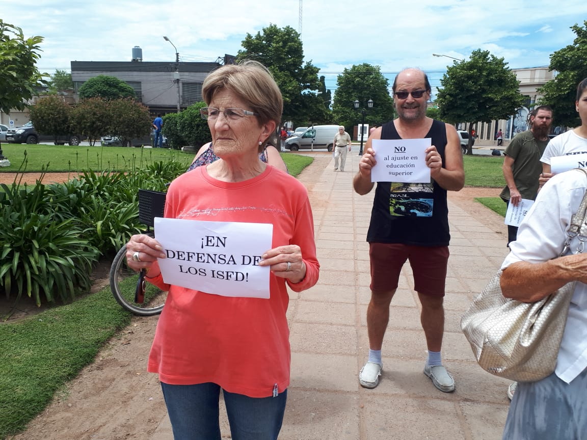 Profesores, alumnos, gremios, padres y concejales de distritos vecinos se reunieron hoy en la plaza principal en contra del recorte educativo, hoy le toca al ISFDYT 44.