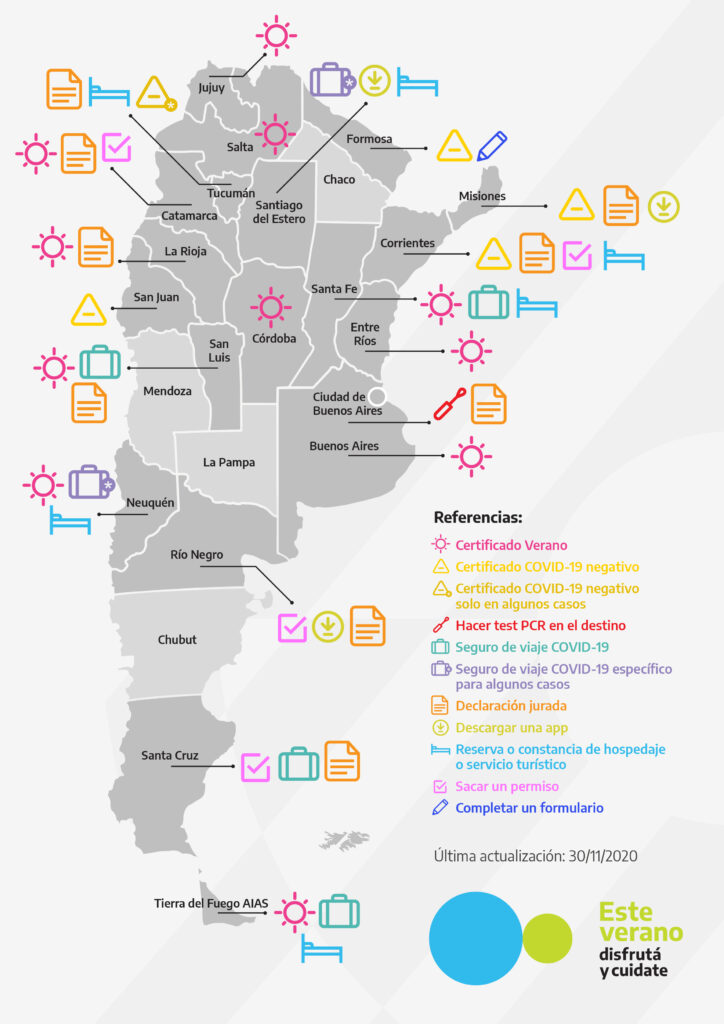 El Ministerio de Turismo y Deportes presentaron la Web Verano desde allí se podrán conocer los requisitos para ingresar a las provincias. Te sugerimos que completes el Certificado Verano Online y descargues la aplicación Cuidar para que los destinos estén mejor preparados para recibirte. Recuerden que es obligatorio en varias provincias.