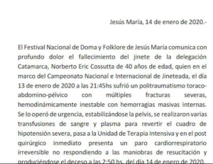 «El Festival Nacional de Doma y Folklore de Jesús María comunica con profundo dolor el fallecimiento del jinete de la delegación Catamarca, Norberto Eric Cossutta de 40 años de edad, quien en el marco del Campeonato Nacional e Internacional de Jineteada, el día 13 de enero de 2020 a las 21:45 hs sufrió un politraumatismo toracoabdomino-pélvico con múltiples fracturas severas, hemodinámicamente inestable con hemorragias masivas internas», comienza el comunicado.